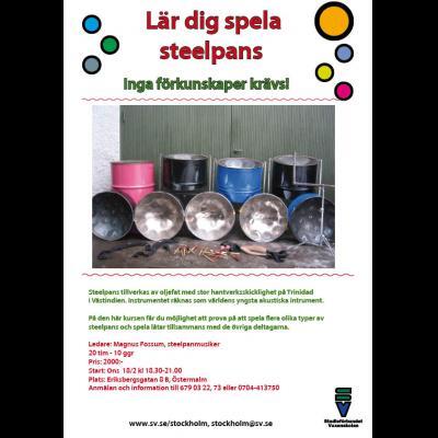 Lär dig spela oljefat! Kursen hålls genom Studieförbundet Vuxenskolan och startar 18/2 kl. 18.30. Lokalen är Eriksbergsgatan 8B på Östermalm. Se länk för mer info: http://steelpan.se/kurs/Steelpan.jpg