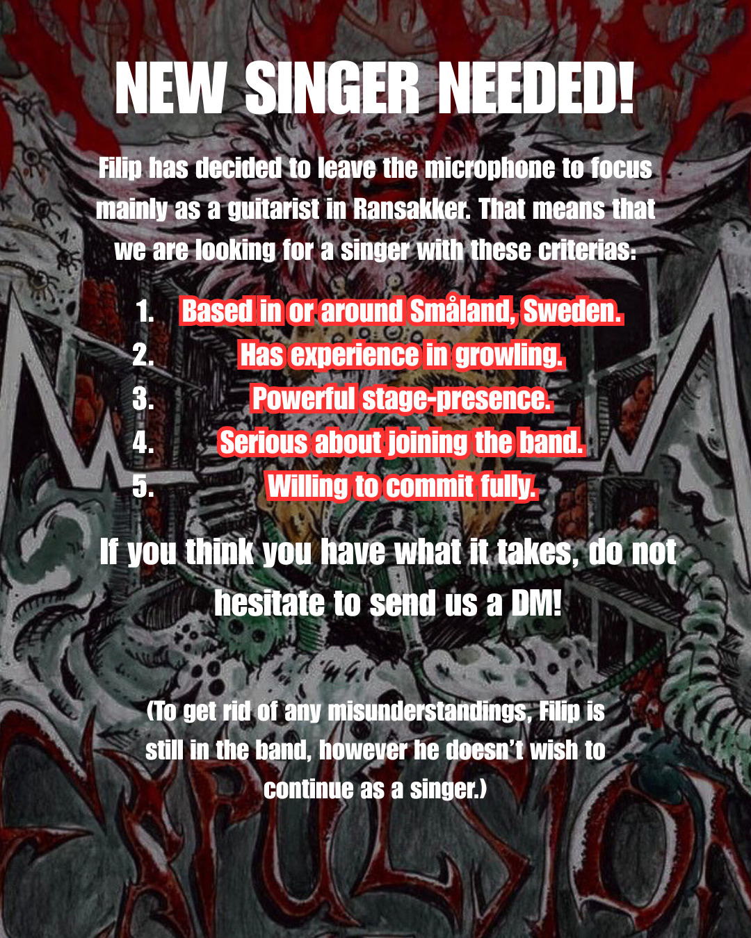 Hej! Dödsmetallbandet RANSAKKER söker en growlare eller growlerska i Småland eller runtom. Hen ska i alla fall kunna repa i Småland. Vi söker någon med otrolig scennärvaro som är redo att få igång publiken och riva loss på scen. Vi har ett album ute som heter EXPULSION OF THE DYING som släpptes i novembras. Hör gärna av er om ni är sugna på att provspela!